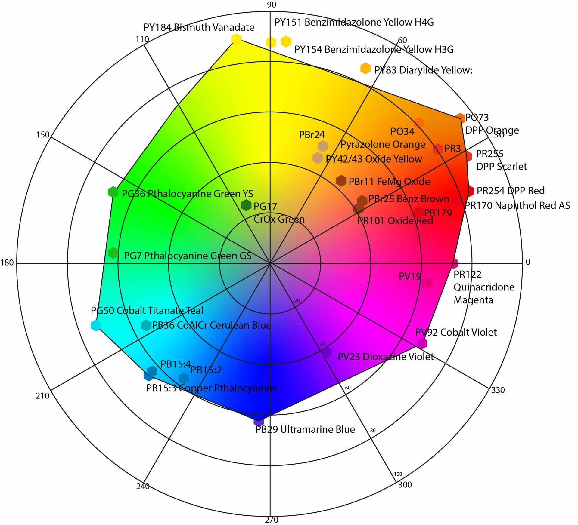 Wir haben die von uns verwendeten Pigmente hauptsächlich mit dem Fokus ausgewählt, das größtmögliche Farbspektrum abzudecken (ausgenommen sind giftige Pigmente).